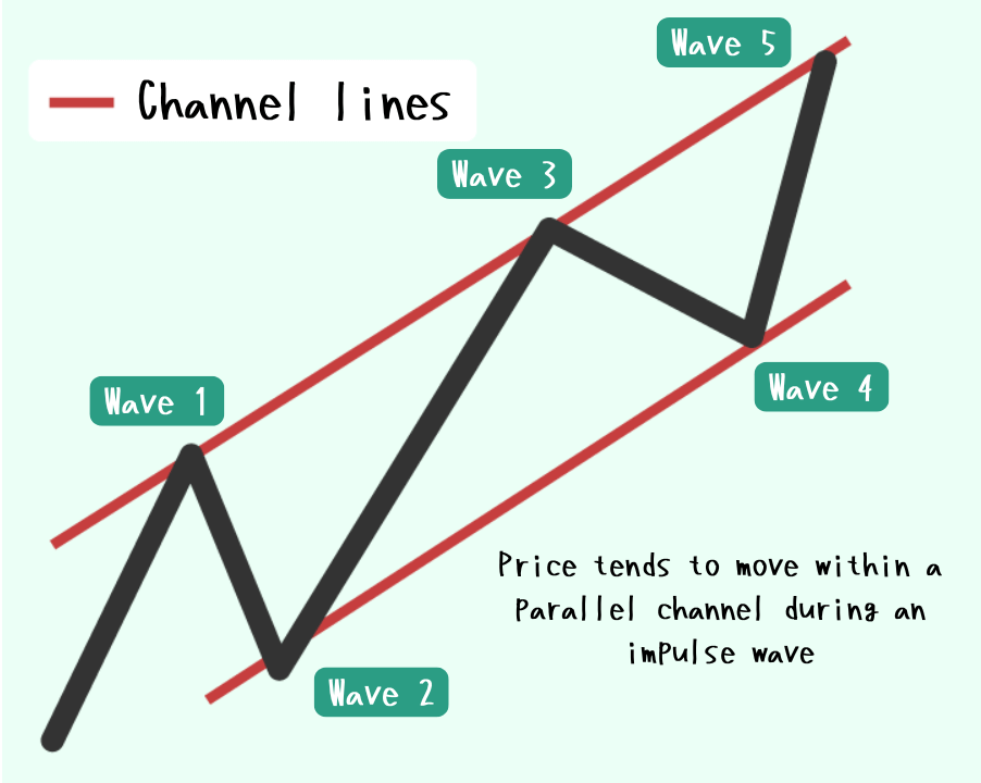 In an Elliott Wave impulse, there’s a tendency for the upper channel line (connecting the ends of Waves 1 and 3) and the lower channel line (connecting the ends of Waves 2 and 4) to form a parallel structure.