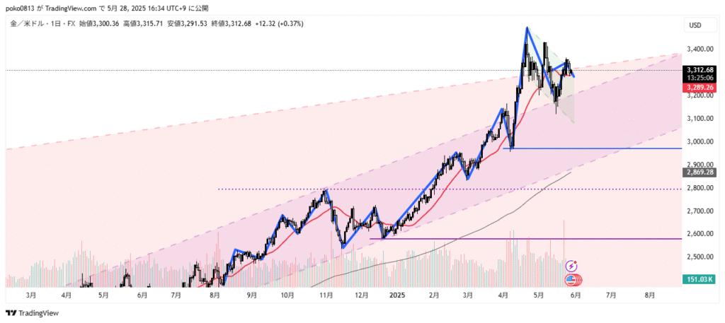 Overall uptrend, but a short-term downtrend has formed with lower highs and lows.