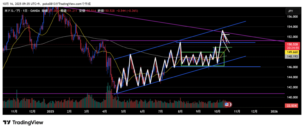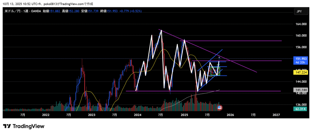 The price broke above the previous high at the 150.8 yen level but then declined near the upper boundary of the weekly triangle.