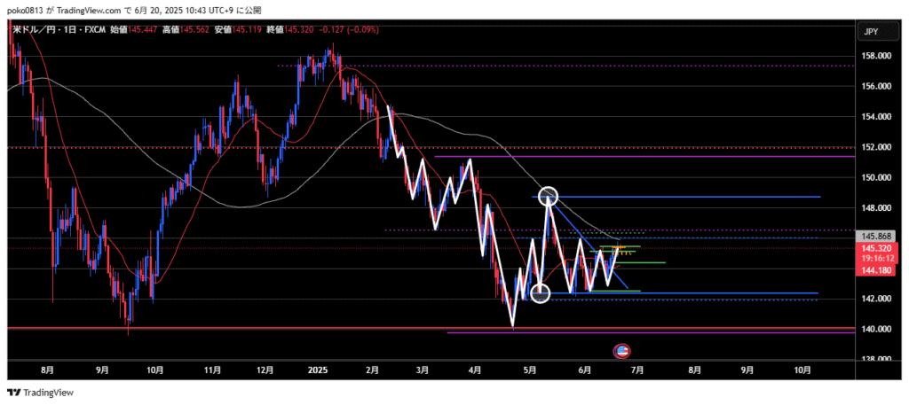 Price is trading near the lower half of the 148.5 to 142.3 range.