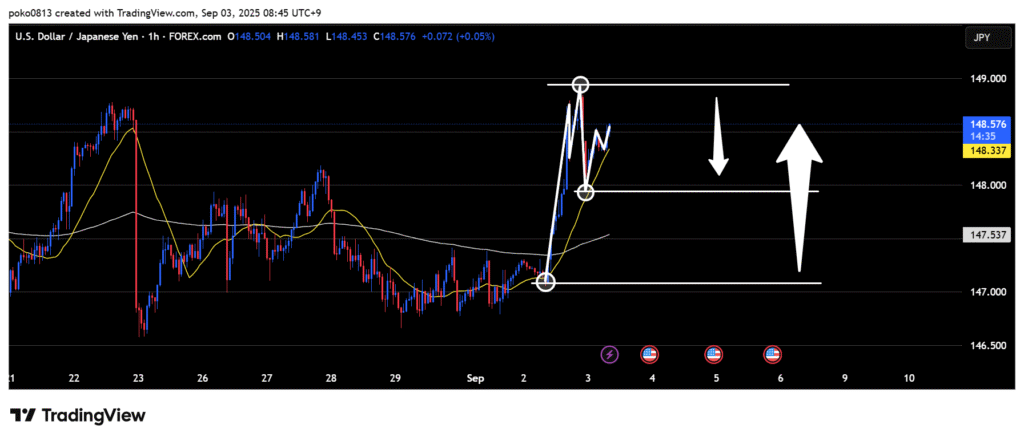 If the price breaks below the endpoint line of the first downward wave (tentative) on the 1-hour chart, I will look for a short entry on the short-term chart.