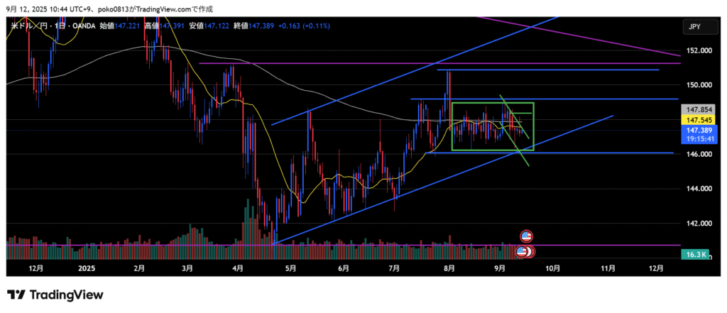 The price has currently bounced off the lower boundary and appears to be rising toward the upper boundary of the triangle.