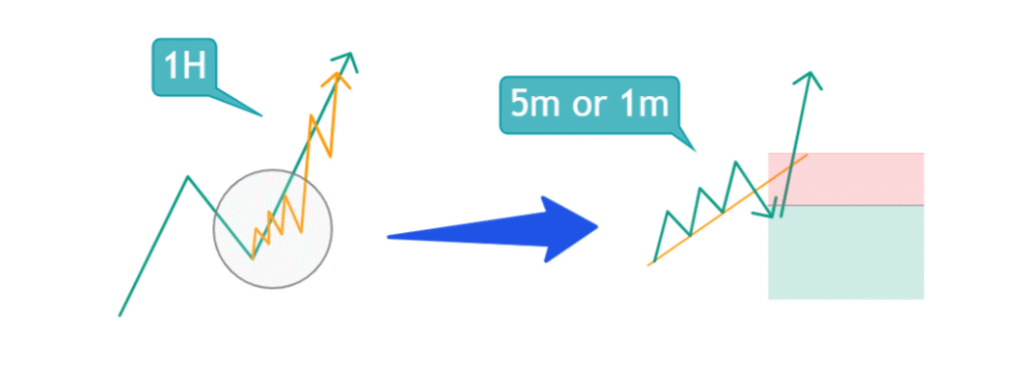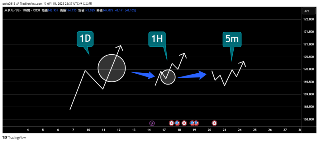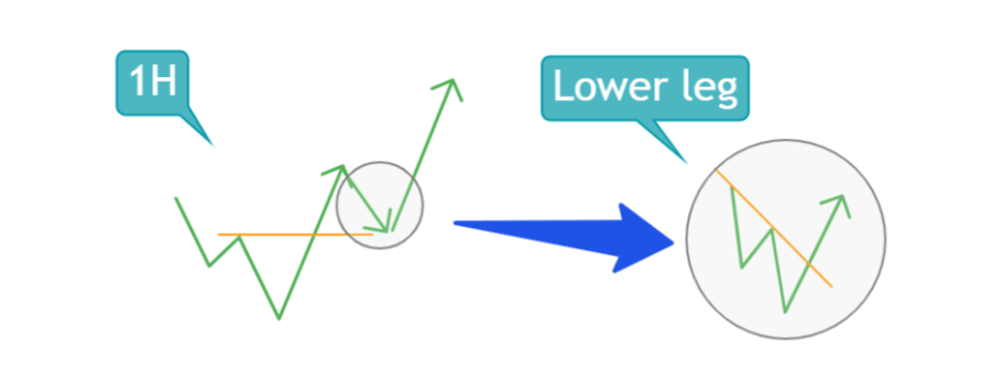 Multi-time frame analysis is mainly about following the chart in order from the upper leg to the lower leg and figuring out which time frame you are currently in.
