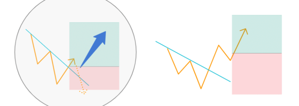 The second is mainly used for scalping, when the price is brought back within the trend line again after an entry.